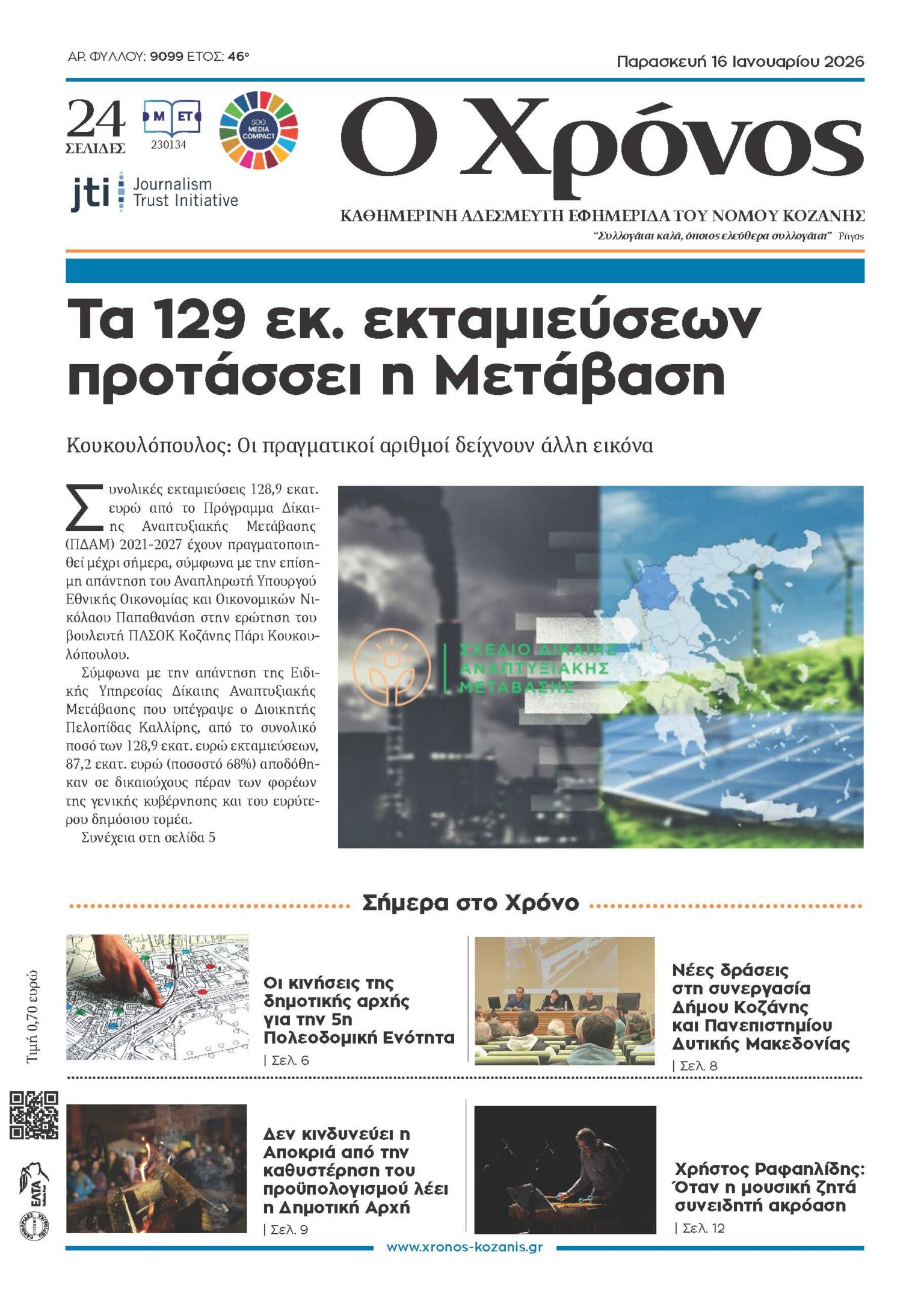 Πρωτοσέλιδο Παρασκευής 16 Ιανουαρίου 2026 Τελευταία ενημέρωση: 15 Ιανουαρίου 2026 23:05 από Χρόνος Κοζάνης Share SHARE ΕΤΙΚΕΤΕΣ:εφημερίδαΟ Χρόνος Κοζάνηςπρωτοσέλιδο Μοιραστείτε την είδηση Facebook Twitter Αντιγραφή συνδέσμου Εκτύπωση ΡΟΗ ΕΙΔΗΣΕΩΝ Πρωτοσέλιδο Παρασκευής 16 Ιανουαρίου 2026 Ευλογιά: Περιορισμένα τα κρούσματα στη Δυτική Μακεδονία Μυστήριο, κωμωδία και θεατρική παράσταση στο νέο πρόγραμμα του «Ολύμπιον» Κοζάνη: Λύση συνεργασίας με Γιώργο Δεληζήση και δύο νέες μεταγραφές Δήμαρχος Κοζάνης: Έχει σταθεροποιηθεί η κατάσταση με τα αδέσποτα Χρήστος Ραφαηλίδης: Όταν η μουσική ζητά συνειδητή ακρόαση Οι κινήσεις της δημοτικής αρχής για την 5η Πολεοδομική Ενότητα Η Κολυμβητική Ένωση Κοζάνης στους 8ους διεθνείς αγώνες «Απόστολος Παύλος» Δήμος Κοζάνης: Δωρεάν στειρώσεις αδέσποτων και δεσποζόμενων ζώων συντροφιάς Δεν κινδυνεύουν οι εκδηλώσεις της Αποκριάς από την καθυστέρηση κατάρτισης του προϋπολογισμού λέει η Δημοτική Αρχή