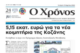 Πρωτοσέλιδο Παρασκευής 23 Ιανουαρίου 2026 Τελευταία ενημέρωση: 22 Ιανουαρίου 2026 23:35 από Χρόνος Κοζάνης Share SHARE ΕΤΙΚΕΤΕΣ:εφημερίδαΟ Χρόνος Κοζάνηςπρωτοσέλιδο Μοιραστείτε την είδηση Facebook Twitter Αντιγραφή συνδέσμου Εκτύπωση ΡΟΗ ΕΙΔΗΣΕΩΝ Πρωτοσέλιδο Τετάρτης 11 Μαρτίου 2026 Εκπαιδευτικό εργαστήριο για τον πληροφοριακό και ψηφιακό γραμματισμό στην Κοβεντάρειο Σε εξέλιξη καθίζηση στο οδικό δίκτυο προς Τριγωνικό Βελτιώνεται ο δρόμος Δρέπανο – Άγιος Δημήτριος – Ακρινή 5,15 εκατ. ευρώ για τα νέα κοιμητήρια της Κοζάνης Σύλληψη 57χρονου με 37 ναρκωτικά δισκία στην Καστοριά Κάλπες για την ανάδειξη συνέδρων του ΠΑΣΟΚ στην Π.Ε. Κοζάνης Δύο συλλήψεις 24χρονων για διακίνηση και κατοχή κάνναβης στη Φλώρινα 37 μετάλλια για την Κολυμβητική Ένωση Κοζάνης στο Εαρινό Κύπελλο Θεσσαλονίκης Τρεις νέες δομές για την αντιμετώπιση εξαρτήσεων στη Δυτική Μακεδονία