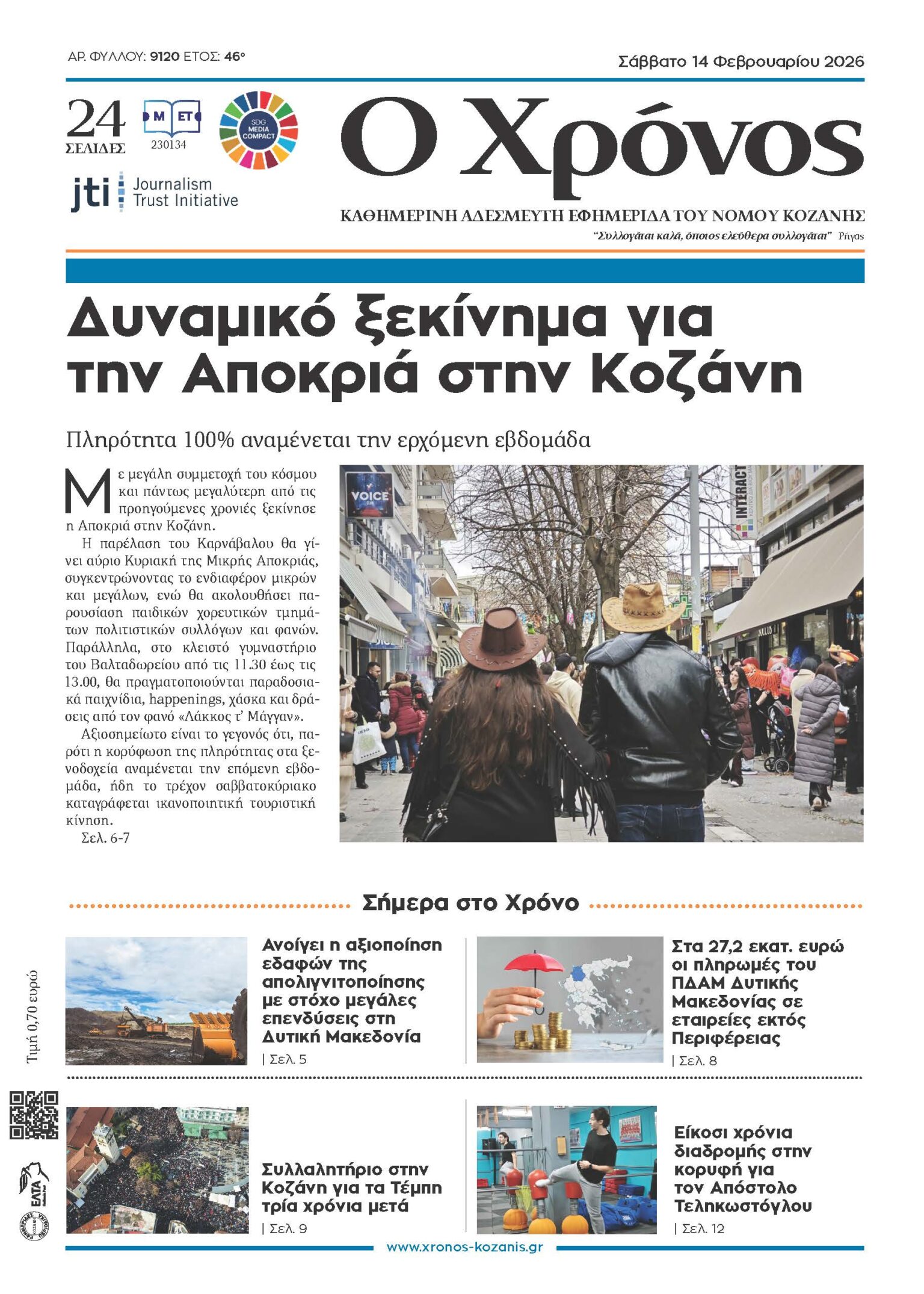 Πρωτοσέλιδο Σαββάτου 14 Φεβρουαρίου 2026 Τελευταία ενημέρωση: 13 Φεβρουαρίου 2026 23:36 από Χρόνος Κοζάνης Share SHARE ΕΤΙΚΕΤΕΣ:εφημερίδαΟ Χρόνος Κοζάνηςπρωτοσέλιδο Μοιραστείτε την είδηση Facebook Twitter Αντιγραφή συνδέσμου Εκτύπωση ΡΟΗ ΕΙΔΗΣΕΩΝ Πρωτοσέλιδο Σαββάτου 14 Φεβρουαρίου 2026 Ο Ε.Ο.Σ. Κοζάνης διοργανώνει την Κυριακή ορειβατική ανάβαση στην κορυφή Δοκίμι Η Μετάβαση Μ.Α.Ε. ξεκινά τη διαδικασία υποβολής αιτημάτων για μακροχρόνια μίσθωση εκτάσεων στην Περιφέρεια Δυτικής Μακεδονίας Οι βιβλιοπροτάσεις της εβδομάδας από τη «Στοά του βιβλίου» Χρυσό βραβείο για το δίκτυο αγρομετεωρολογικών σταθμών της Π.Ε. Καστοριάς Πρώτο βραβείο για το R4Schools του Δήμου Κοζάνης στην ανακύκλωση στα σχολεία Μαθητές του 2ου ΕΠΑΛ Κοζάνης σε κινητικότητα Erasmus+ στη Λεμεσό Ξεκινά η μελέτη για την ολοκλήρωση των μνημείων «Ακρίτας» και «Μνημείο Μνήμης» σε Νέα Χαραυγή και Σκήτη Άδειαζε τα παγκάρια Ιερού Ναού στην Κοζάνη και συνελήφθη για τρεις κλοπές Στα 27,2 εκατ. ευρώ οι πληρωμές του ΠΔΑΜ Δυτικής Μακεδονίας σε εταιρείες εκτός Περιφέρειας