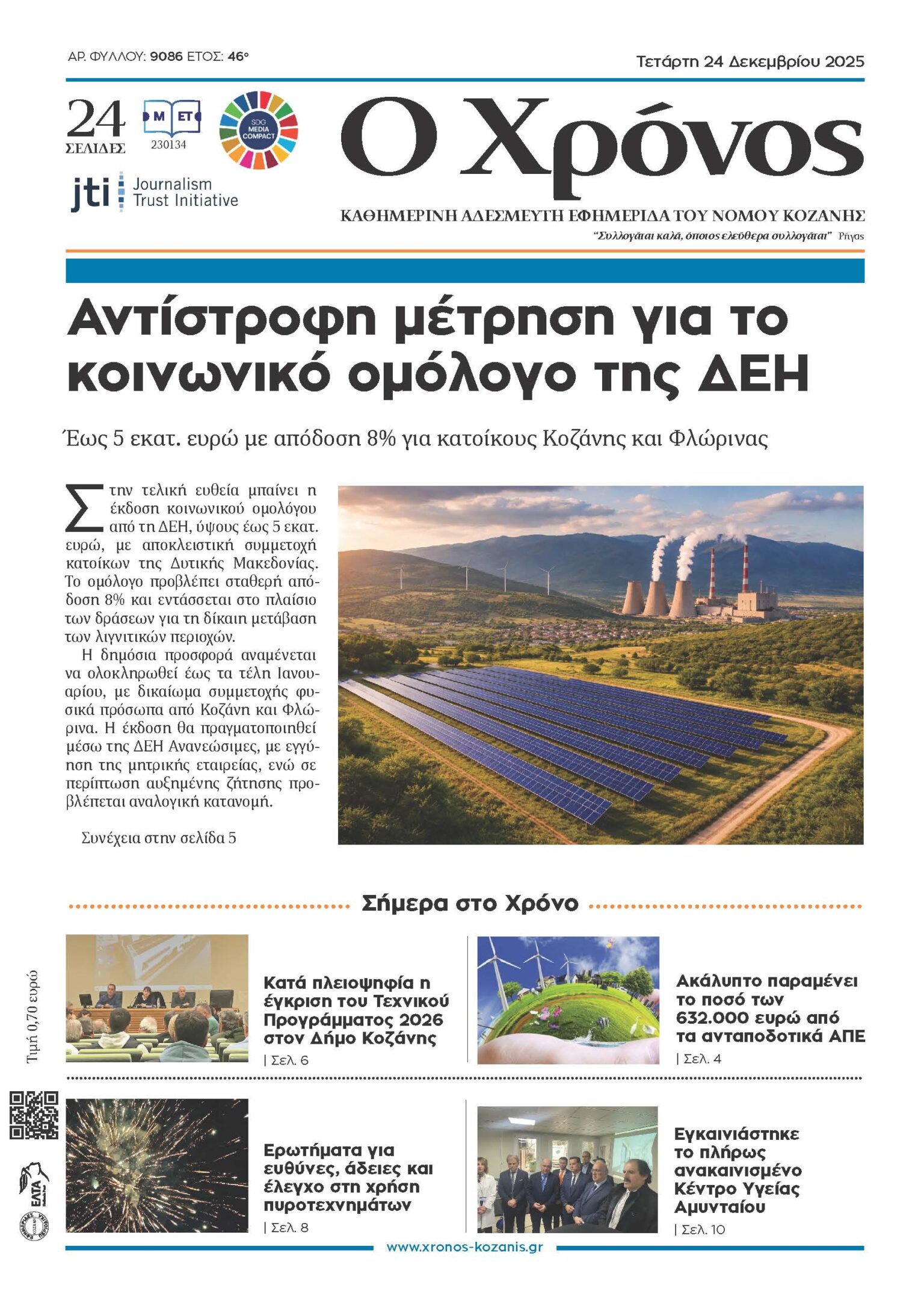 Πρωτοσέλιδο Τετάρτης 24 Δεκεμβρίου 2025 Τελευταία ενημέρωση: 23 Δεκεμβρίου 2025 21:57 από Χρόνος Κοζάνης Share SHARE ΕΤΙΚΕΤΕΣ:εφημερίδαΟ Χρόνος Κοζάνηςπρωτοσέλιδο Μοιραστείτε την είδηση Facebook Twitter Αντιγραφή συνδέσμου Εκτύπωση ΡΟΗ ΕΙΔΗΣΕΩΝ Πρωτοσέλιδο Τετάρτης 24 Δεκεμβρίου 2025 Συνεχίζεται η διακοπή κυκλοφορίας στην Εγνατία Οδό στο ύψος της Σιάτιστας Κατά πλειοψηφία η έγκριση του Τεχνικού Προγράμματος 2026 στον Δήμο Κοζάνης Αντίστροφη μέτρηση για το κοινωνικό ομόλογο της ΔΕΗ Η απάντηση του Υπουργείου για το υποκατάστημα της Εθνικής Τράπεζας στα Σέρβια Εγκαινιάστηκε το πλήρως ανακαινισμένο Κέντρο Υγείας Αμυνταίου Τεχνικό Πρόγραμμα 2026: «Πάμε κι όπου βγει» από την Δημοτική Αρχή Κοκκαλιάρη Παράταση και ευνοϊκότερη αξιολόγηση για τις Ενεργειακές Κοινότητες σε Κοζάνη και Φλώρινα Κραυγή αγωνίας από τους συνταξιούχους της ΔΕΗ για το μέλλον της Δυτικής Μακεδονίας Συγκροτήθηκε ο ευρωπαϊκός όμιλος CLIMANET με συμμετοχή του Δήμου Κοζάνης