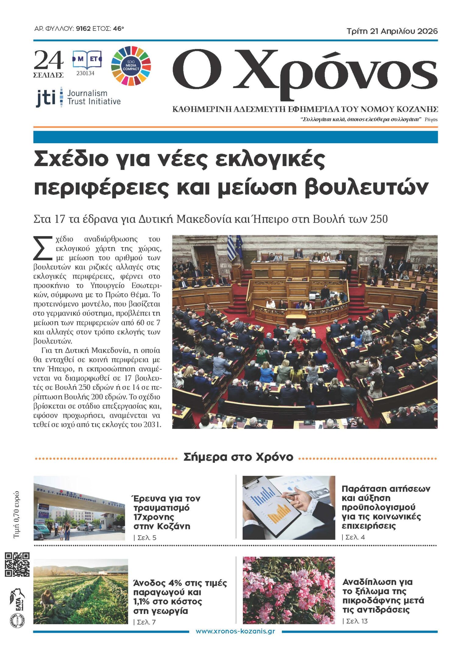 Πρωτοσέλιδο Τρίτης 21 Απριλίου 2026 Τελευταία ενημέρωση: 20 Απριλίου 2026 19:16 από Χρόνος Κοζάνης Share SHARE ΕΤΙΚΕΤΕΣ:εφημερίδαΟ Χρόνος Κοζάνηςπρωτοσέλιδο Μοιραστείτε την είδηση Facebook Twitter Αντιγραφή συνδέσμου Εκτύπωση ΡΟΗ ΕΙΔΗΣΕΩΝ Πρωτοσέλιδο Τρίτης 21 Απριλίου 2026 «Χτύπησε το κεφάλι σε πλακάκι» λέει ο πατέρας του 5χρονου από την Κοζάνη που μεταφέρθηκε στο Ιπποκράτειο Θεσσαλονίκης Αρναούτογλου προς Κομισιόν για HEMS: Καθυστερήσεις στην εναέρια διάσωση στην Ελλάδα Αναδίπλωση για το ξήλωμα της πικροδάφνης μετά τις αντιδράσεις Γέφυρα ζωής για 5χρονο παιδί από την Κοζάνη στη Θεσσαλονίκη Ανησυχία για το μέλλον εργαζομένων στα λιγνιτικά πεδία μετά το κλείσιμο των μονάδων Απάτη με λεία 19.000 ευρώ σε βάρος 84χρονης στην Καστοριά Πρωτιά για το Πανεπιστήμιο Δυτικής Μακεδονίας σε διεθνή διαγωνισμό ρομποτικής Τρεις συλλήψεις για επικίνδυνη οδήγηση και μέθη σε Κοζάνη, Γρεβενά και Φλώρινα Άνοδος 4% στις τιμές παραγωγού και 1,1% στο κόστος στη γεωργία