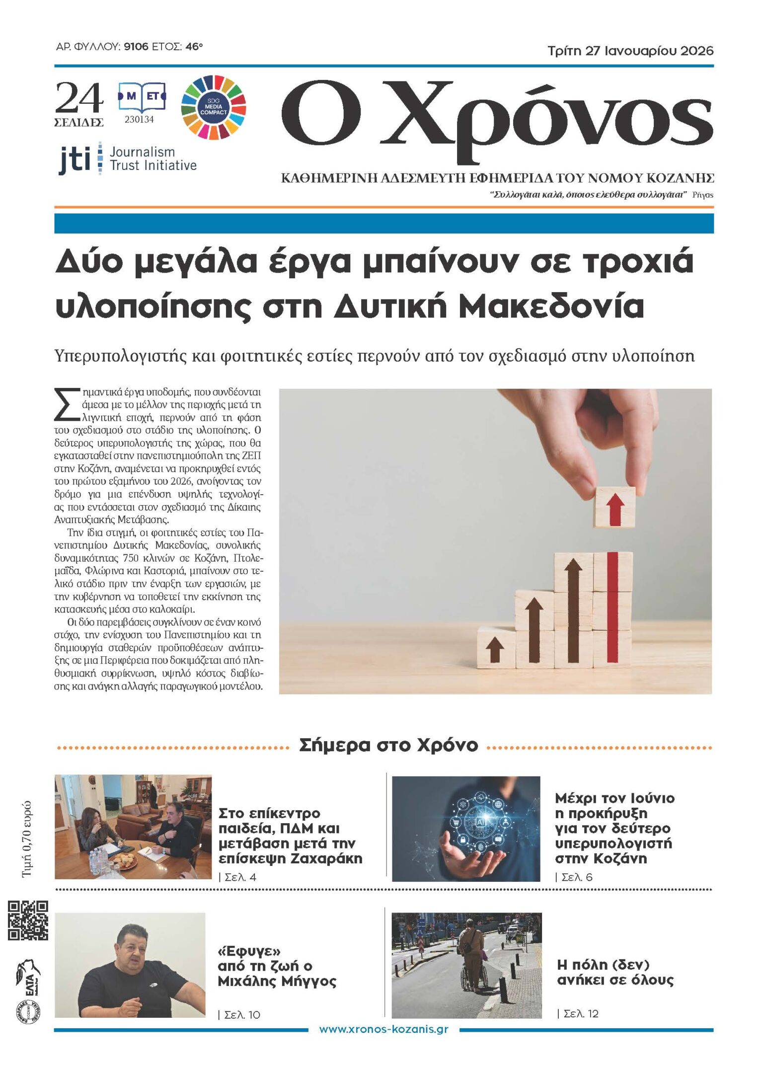 Πρωτοσέλιδο Τρίτης 27 Ιανουαρίου 2026 Τελευταία ενημέρωση: 26 Ιανουαρίου 2026 19:44 από Χρόνος Κοζάνης Share SHARE ΕΤΙΚΕΤΕΣ:εφημερίδαΟ Χρόνος Κοζάνηςπρωτοσέλιδο Μοιραστείτε την είδηση Facebook Twitter Αντιγραφή συνδέσμου Εκτύπωση ΡΟΗ ΕΙΔΗΣΕΩΝ Πρωτοσέλιδο Τρίτης 27 Ιανουαρίου 2026 Δωρεάν εκπαίδευση και πιστοποίηση Πρώτων Βοηθειών για εκπαιδευτές οδηγών στην Κοζάνη Ιδρύεται η Ζώνη Καινοτομίας και το Strategic Hub Δυτικής Μακεδονίας Κυκλοφοριακές ρυθμίσεις στην οδό Σιακαβάρα λόγω έργων ανάπλασης Στο προσκήνιο τα λιγνιτικά εδάφη στη Δυτική Μακεδονία και η αποκατάστασή τους Συλλυπητήρια δήλωση Νίκου Ανδρουλάκη, Προέδρου ΠΑΣΟΚ-Κινήματος Αλλαγής για τον θάνατο του Μιχάλη Μήγγου Κριτική του ΚΚΕ στην εκπαιδευτική πολιτική μετά την επίσκεψη Ζαχαράκη στην Κοζάνη Εντατικοί έλεγχοι για τη χρήση κράνους στη Δυτική Μακεδονία Εντοπίστηκαν νεκρές 3 εργαζόμενες στη ΒΙΟΛΑΝΤΑ μετά από έκρηξη τα ξημερώματα της Δευτέρας Έφυγε από τη ζωή ο Μιχάλης Μήγγος