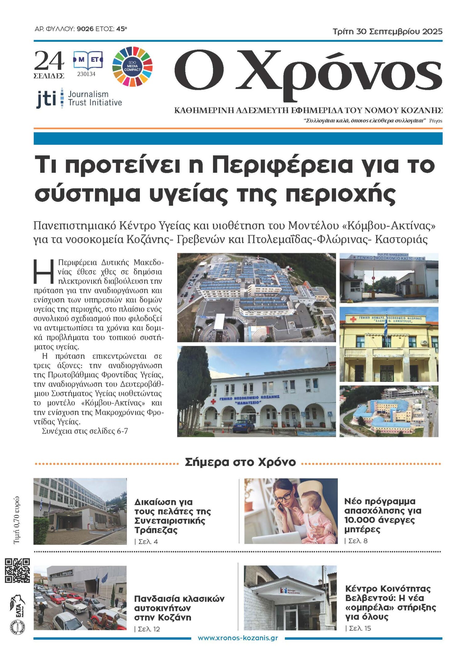 Πρωτοσέλιδο Τρίτης 30 Σεπτεμβρίου 2025 Τελευταία ενημέρωση: 29 Σεπτεμβρίου 2025 19:40 από Χρόνος Κοζάνης Share SHARE ΕΤΙΚΕΤΕΣ:εφημερίδαΟ Χρόνος Κοζάνηςπρωτοσέλιδο Μοιραστείτε την είδηση Facebook Twitter Αντιγραφή συνδέσμου Εκτύπωση ΡΟΗ ΕΙΔΗΣΕΩΝ Οι “Μνήμες Λιγνίτη” στην τελική ευθεία Εγγραφές στο Φωτογραφικό Εργαστήρι του Δήμου Κοζάνης Συνάντηση για την ενίσχυση του Μποδοσάκειου Νοσοκομείου Πτολεμαΐδας HELLENiQ ENERGY: Για 17η συνεχή χρονιά επιβραβεύει τη νέα γενιά Απάντηση της Διευθύντριας Πολιτισμού και Αθλητισμού του Δήμου Κοζάνης Φωτεινής Διάφα στα γραφόμενα της Φανής Φτάκα για την Πανδώρα Η εξέταση του πρώην προέδρου του ΟΠΕΚΕΠΕ Ευ. Σημανδράκου στην Εξεταστική Έργο προσβασιμότητας 1,44 εκατ. ευρώ στο Πανεπιστήμιο Δυτικής Μακεδονίας Το Ταεκβοντό ως εργαλείο διαχείρισης συναισθημάτων: Η προσέγγιση του Χρήστου Αλμασίδη Μεγάλες ελλείψεις στην παράλληλη στήριξη στα σχολεία της Κοζάνης Δυναμικό παρών στην απεργία για το 13ωρο στην Κοζάνη