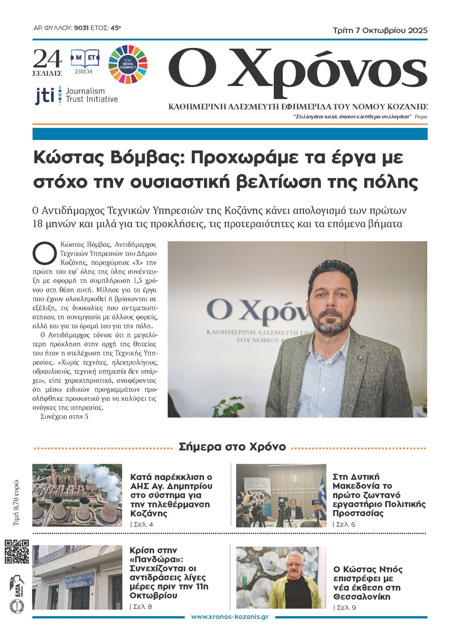 Πρωτοσέλιδο Τρίτης 7 Οκτωβρίου 2025 Τελευταία ενημέρωση: 6 Οκτωβρίου 2025 22:05 από Χρόνος Κοζάνης Share SHARE ΕΤΙΚΕΤΕΣ:εφημερίδαΟ Χρόνος Κοζάνηςπρωτοσέλιδο Μοιραστείτε την είδηση Facebook Twitter Αντιγραφή συνδέσμου Εκτύπωση ΡΟΗ ΕΙΔΗΣΕΩΝ Πρωτοσέλιδο Τρίτης 7 Οκτωβρίου 2025 Προσφεύγει στην Αποκεντρωμένη η Αιανή για τη συγχώνευση του Ληξιαρχείου Εκπαίδευση χωρίς σύνορα με τη σφραγίδα του Πανεπιστημίου Δυτικής Μακεδονίας Προσβάσιμη εμπειρία στη φύση από το Πρότυπο Δάσος Δυτικής Μακεδονίας Ενημερωτική εκδήλωση ανακύκλωσης και επαναχρησιμοποίησης από τη ΔΙΑΔΥΜΑ στο Δρέπανο Εξιχνίαση τηλεφωνικής απάτης σε βάρος 80χρονης στα Γρεβενά Μιχάλης Χαραλαμπίδης, ένας Οικουμενικός Έλληνας Κρίση στην «Πανδώρα»: Συνεχίζονται οι αντιδράσεις, αιχμές και τα ανοιχτά μέτωπα ενόψει της 11ης Οκτωβρίου Απολογισμός Σεπτεμβρίου ΕΛ.ΑΣ: 599 συλλήψεις και 46 εξιχνιάσεις στη Δυτική Μακεδονία Με επιτυχία το 3ο Stakeholders Meeting του έργου Interreg Europe «COMMIT» στην Εορδαία