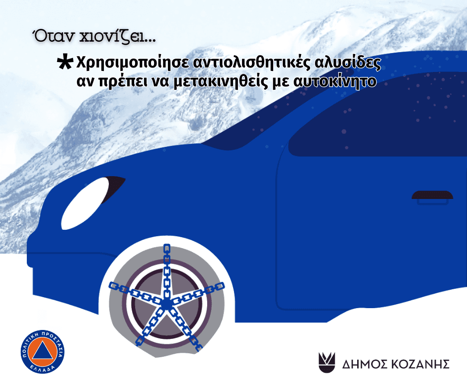 Ιδιαίτερη προσοχή απαιτείται και στις μετακινήσεις με όχημα. Συνιστάται η αποφυγή οδήγησης σε δύσβατες ή ορεινές διαδρομές κατά τη διάρκεια έντονων χιονοπτώσεων, η τήρηση αποστάσεων ασφαλείας και η αλλαγή πορείας όπου κριθεί απαραίτητο. Σε περίπτωση ακινητοποίησης οχήματος, οι οδηγοί καλούνται να παραμείνουν εντός αυτού και να ακολουθήσουν τα προβλεπόμενα μέτρα ασφαλείας μέχρι την παροχή βοήθειας. «Τοποθετείστε στην κεραία του ραδιοφώνου ή σε άλλο εμφανές σημείο ένα ύφασμα με έντονο χρώμα ώστε να σας εντοπίσουν οι ομάδες διάσωσης. Ανάβετε τη μηχανή για 10 λεπτά ανά ώρα και διατηρείστε την εξάτμιση καθαρή από το χιόνι» αναφέρεται στην ανακοίνωση.