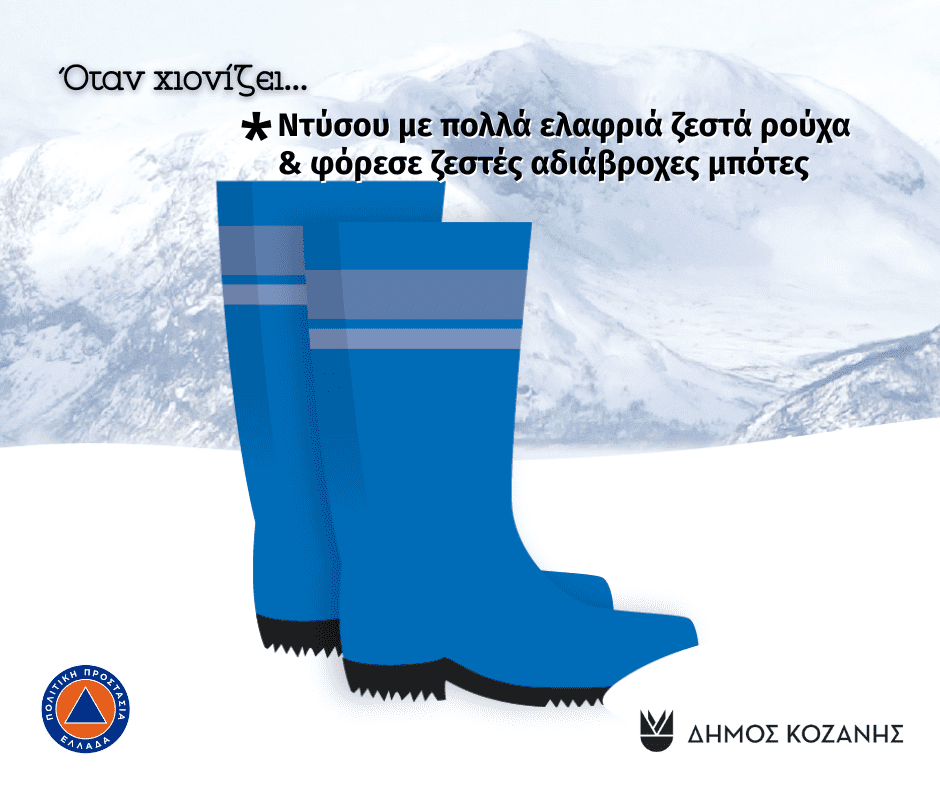 Με βάση τα δεδομένα του δελτίου, η Πολιτική Προστασία του Δήμου Κοζάνης απευθύνει σύσταση προς τους πολίτες να είναι ιδιαίτερα προσεκτικοί και κατάλληλα προετοιμασμένοι, ακολουθώντας τις οδηγίες της Γενικής Γραμματείας Πολιτικής Προστασίας για την αντιμετώπιση των χιονοπτώσεων.