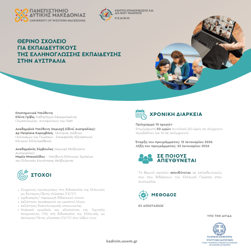 Ένα σύγχρονο, εξ αποστάσεως Θερινό Σχολείο για εκπαιδευτικούς της ελληνικής γλώσσας στην Αυστραλία υλοποιείται από το ΚΕΔΙΒΙΜ του Πανεπιστημίου Δυτικής Μακεδονίας και τελεί υπό την αιγίδα της Γενικής Γραμματείας Απόδημου Ελληνισμού και Δημόσιας Διπλωματίας. Την επιστημονική ευθύνη του προγράμματος έχει η Καθηγήτρια Εφαρμοσμένης Γλωσσολογίας και Αντιπρύτανις του Πανεπιστημίου Δυτικής Μακεδονίας, Ελένη Γρίβα.
