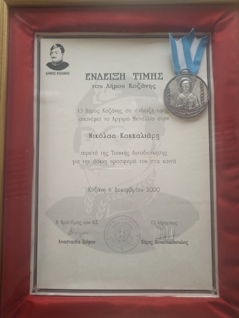 Για την 20ετή συνεχή προσφορά του στα Δημαρχιακά κέντρα αποφάσεων, στις 06/12/2000 τιμήθηκε με αναμνηστικό μετάλλιο για την προσφορά του στο Δήμο Κοζάνης και για τις υπηρεσίες του