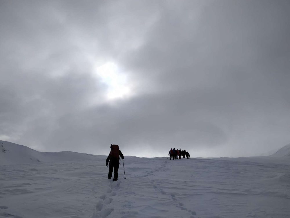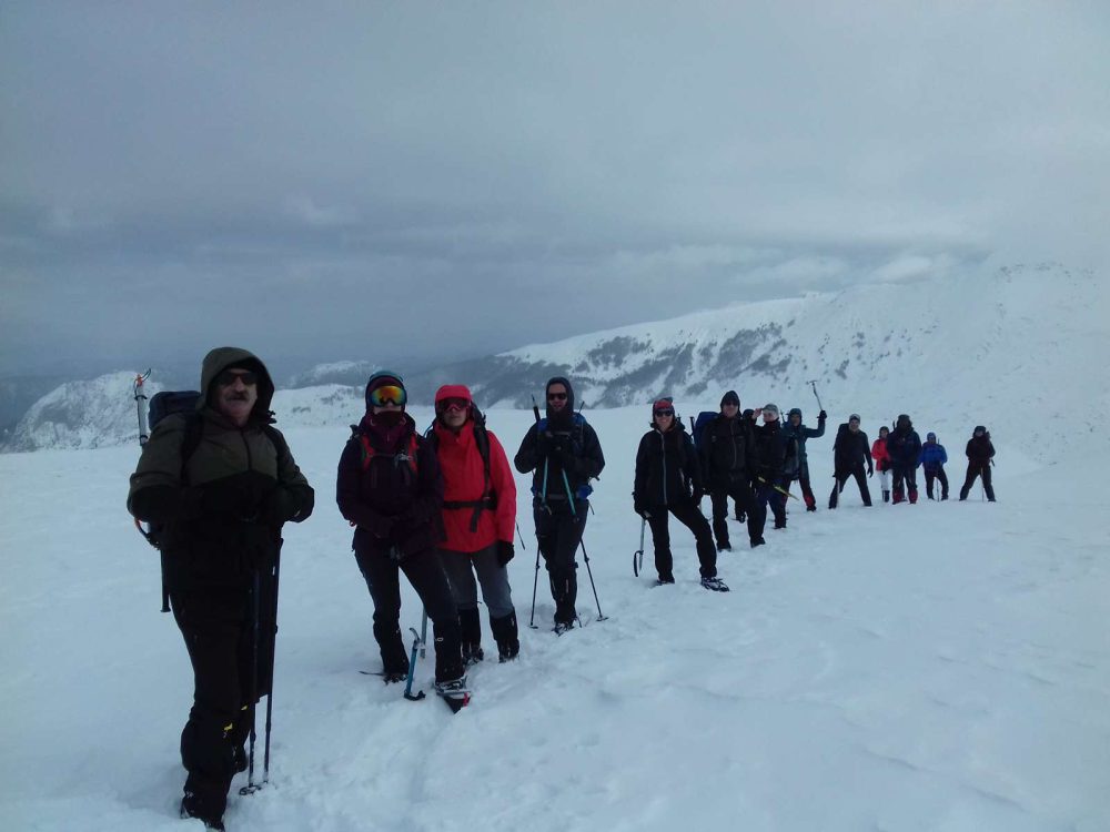 Η επιστροφή από το ίδιο μονοπάτι, με το χιόνι τώρα καλά πατημένο από την ανάβαση είναι ευκολότερη και ταχύτερη. Η ομάδα συγκεντρώνεται γύρω από το λεωφορείο. Τα χαμόγελα και το κέφι στα ύψη. Ο Αλέξανδρος μοιράζει μπύρες και ο Θοδωρής με τον αυλό του κλείνει ιδανικά την εξόρμηση στους ρυθμούς του “bella ciao” και “Katyusha”.