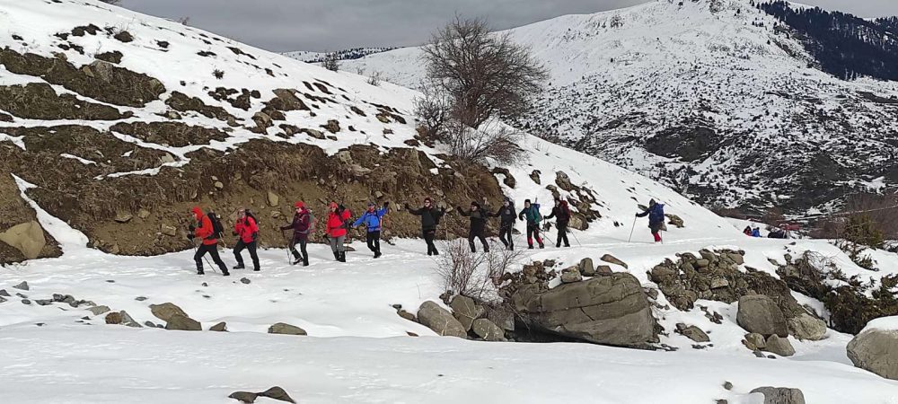 Βρισκόμαστε λίγο πριν τον ερχομό της άνοιξης, όμως τα χιόνια στα βουνά είναι στο μεγαλύτερο ύψος του φετινού, σχετικά άνυδρου και ζεστού χειμώνα. Οι γύρω βουνοκορφές, κατάλευκες, αποτελούν πρόκληση και εκπέμπουν πρόσκληση στους φίλους των ορεινών δραστηριοτήτων.