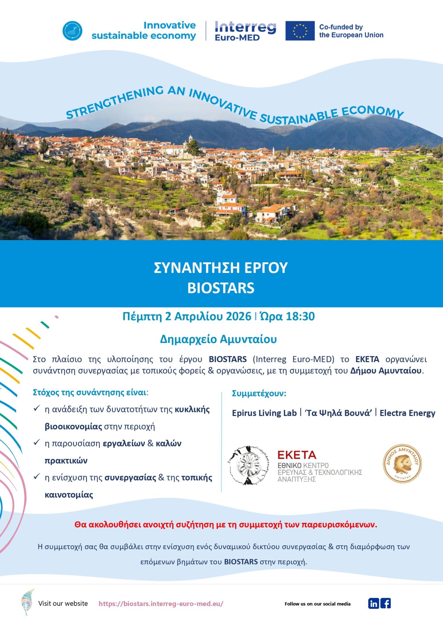 Η εκδήλωση διοργανώνεται στο πλαίσιο του ευρωπαϊκού έργου BIOSTARS (Interreg Euro-MED) από το ΕΚΕΤΑ, σε συνεργασία με τον Δήμο Αμυνταίου, και φέρνει κοντά τοπικούς φορείς, επιχειρήσεις, οργανώσεις και πολίτες με στόχο τη διαμόρφωση ενός δυναμικού οικοσυστήματος βιοοικονομίας στην περιοχή.