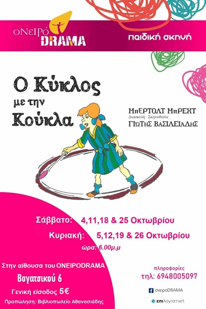 Με παραστάσεις και αυτό το Σαββατοκύριακο 18 και 19 Οκτωβρίου συνεχίζεται από τη θεατρική ομάδα Ονειρόdrama το έργο του Μπέρτολντ Μπρεχτ «Ο κύκλος με την κούκλα», σε διασκευή και σκηνοθεσία του Γιώτη Βασιλειάδη.