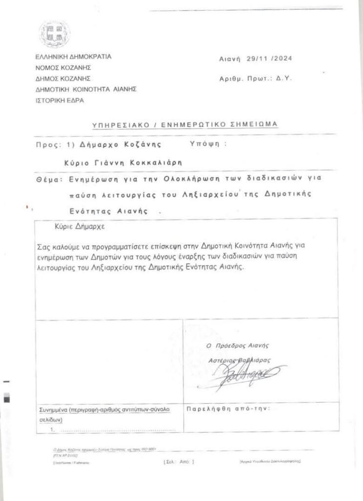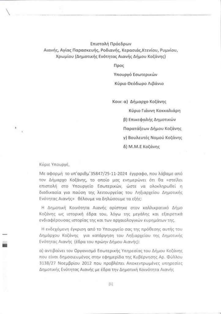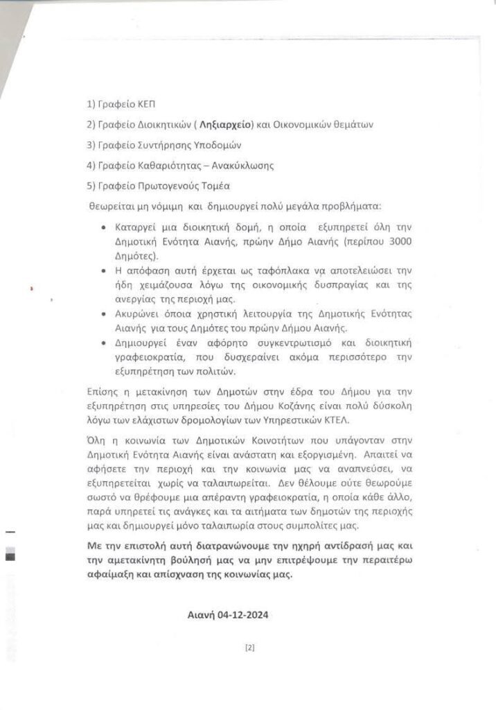 Την επιστολή υπογράφουν οι Πρόεδροι της Δημοτικής Ενότητας Αιανής.