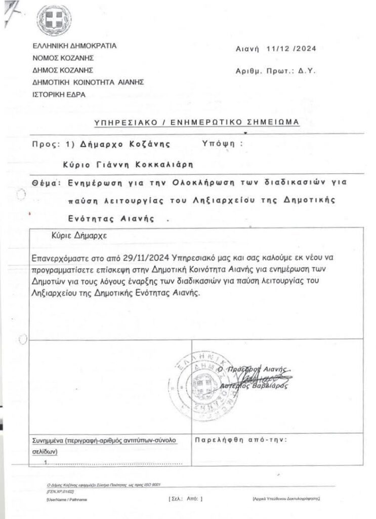 Ακολούθησε επιστολή διαμαρτυρίας στις 4 Δεκεμβρίου 2024 προς τον Υπουργό Εσωτερικών, με κοινοποιήσεις σε όλες τις αρμόδιες πολιτικές και θεσμικές αρχές του τόπου, ενώ με δύο επιπλέον υπηρεσιακά σημειώματα (29-11-2024 και 11-12-2024) ζητήθηκε από τον δήμαρχο να επισκεφθεί την Αιανή και να ενημερώσει επίσημα τους πολίτες για το θέμα.