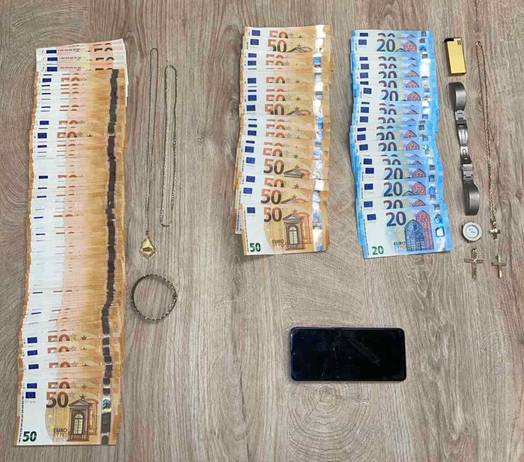 Στην κατοχή του συλληφθέντα βρέθηκαν και κατασχέθηκαν 6.600 ευρώ και διάφορα τιμαλφή, τα οποία θα αποδοθούν στις νόμιμες κατόχους τους, καθώς και ένα κινητό τηλέφωνο με δύο κάρτες SIM που χρησιμοποιήθηκαν ως μέσα τέλεσης των αξιόποινων πράξεων.