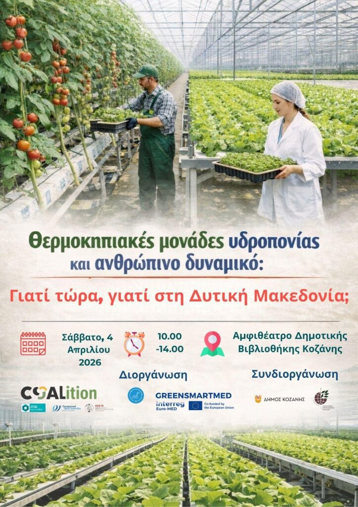 Το Σάββατο 4 Απριλίου στην Κοζάνη, ανοίγουμε μια μεγάλη & κρίσιμη συζήτηση για το παραγωγικό αυτό μοντέλο και πώς οι θερμοκηπιακές μονάδες υδροπονίας μπορούν να αποτελέσουν έναν μοχλό ανάπτυξης, απασχόλησης και επιχειρηματικής δράσης  στη Δυτική Μακεδονία.