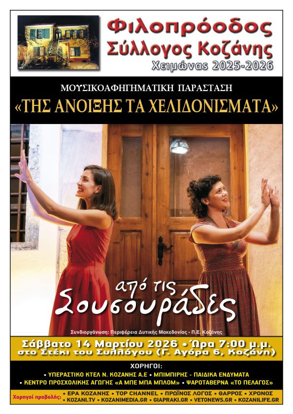Ο Φιλοπρόοδος Σύλλογος Κοζάνης προσκαλεί όλους τους μικρούς, καλούς του φίλους στο φιλόξενο Αρχοντικό μας για να υποδεχτούμε την άνοιξη που έφτασε, με μια μουσικοαφηγηματική παράσταση λαϊκών παραμυθιών και τραγουδιών της παράδοσης που με περισσή φροντίδα θα μας παρουσιάσουν οι Σουσουράδες Αγγελική Αγαλιανού και Ελεάνα Χατζάκη.