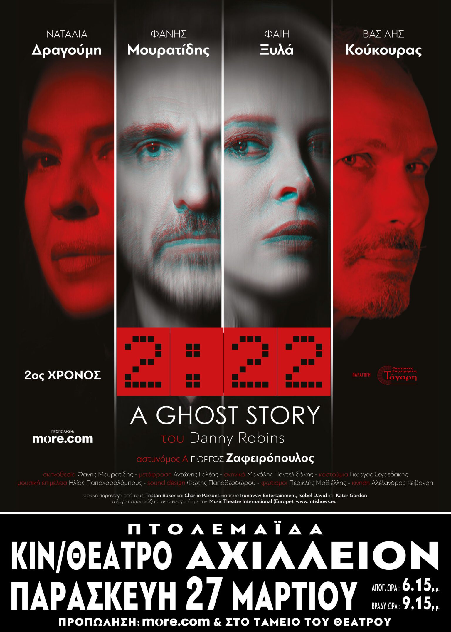 Στη σκηνή του Θεάτρου ΑΛΑΜΠΡΑ, για πρώτη φορά στην Ελλάδα, παρουσιάστηκε με μεγάλη επιτυχία τη θεατρική σεζόν 2024-2025, σε σκηνοθεσία του Φάνη Μουρατίδη, το έργο “2:22 – A Ghost Story” του Danny Robbins, ένα σύγχρονο υπερφυσικό θρίλερ που έχει αποσπάσει διθυραμβικές κριτικές στο West End του Λονδίνου, υποψηφιότητες για 3 βραβεία Laurence Olivier, καθώς και το βραβείο «Καλύτερου Νέου Έργου» στα Βραβεία Whats On Stage, το 2022.