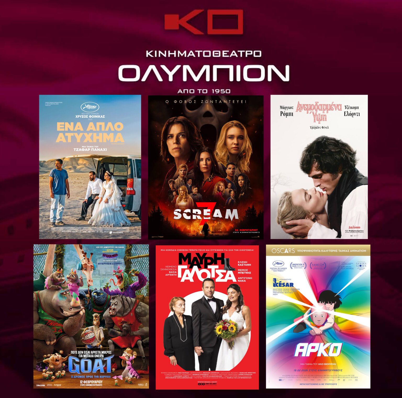 Από την Πέμπτη 26 Φεβρουαρίου έως και την Τετάρτη 4 Μαρτίου, το «Ολύμπιον» παρουσιάζει ένα  πλούσιο κινηματογραφικό πρόγραμμα: Προβάλλεται το «Scream 7», η συνέχεια της γνωστής σειράς ταινιών τρόμου με πρωταγωνίστρια την Κόρτνεϊ Κοξ. Συνεχίζεται η προβολή της αισθηματικής ταινίας  «Ανεμοδαρμένα Ύψη», της κινηματογραφική απόδοσης του κλασικού μυθιστορήματος της Emily Bronte. «Ένα Απλό Ατύχημα» του Τζαφάρ Παναχί, που τιμήθηκε με τον Χρυσό Φοίνικα στις Κάννες και είναι υποψήφιο για Όσκαρ Καλύτερης Διεθνούς Ταινίας. Μόνο τη Δευτέρα 2 Μαρτίου προβάλλεται η θεατρική κωμωδία «Μαύρη Γαλότσα». Για το παιδικό κοινό, τρεις επιλογές αυτή την εβδομάδα: «Αρκο», «Goat» και «Μπομπ Σφουγγαράκης».
