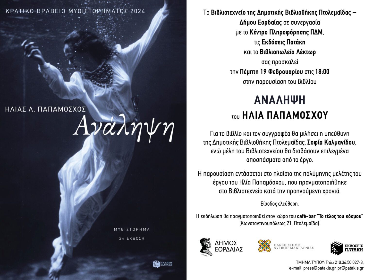 Το Βιβλιοτεχνείο της Δημοτικής Βιβλιοθήκης Πτολεμαΐδας – Δήμου Εορδαίας, σε συνεργασία με το Κέντρο Πληροφόρησης ΠΔΜ και τις Εκδόσεις Πατάκη, διοργανώνουν παρουσίαση του μυθιστορήματος Ανάληψη του Ηλία Παπαμόσχου.