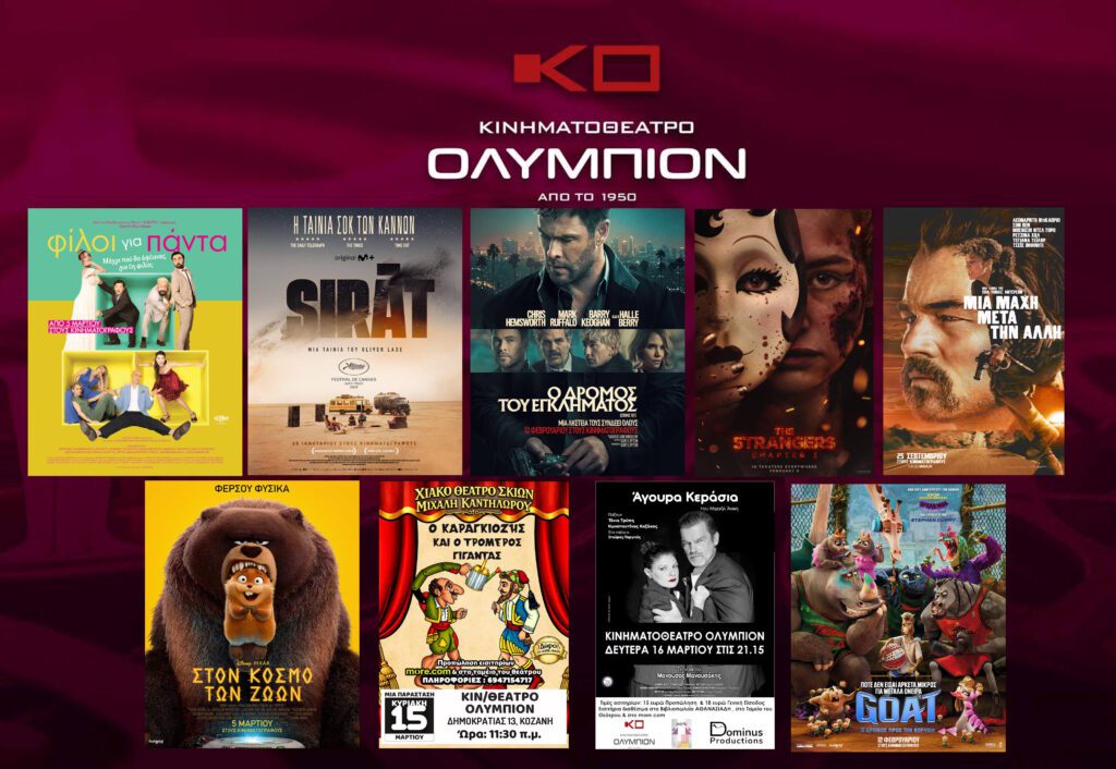 Το πρόγραμμα του κινηματογράφου «Ολύμπιον» που ισχύει από σήμερα Πέμπτη 12 Μαρτίου 2026 έως και την Τετάρτη 18 Μαρτίου 2026 περιλαμβάνει ταινίες για όλα τα γούστα και όλες τις ηλικίες, αλλά και θεατρικές παραστάσεις.
